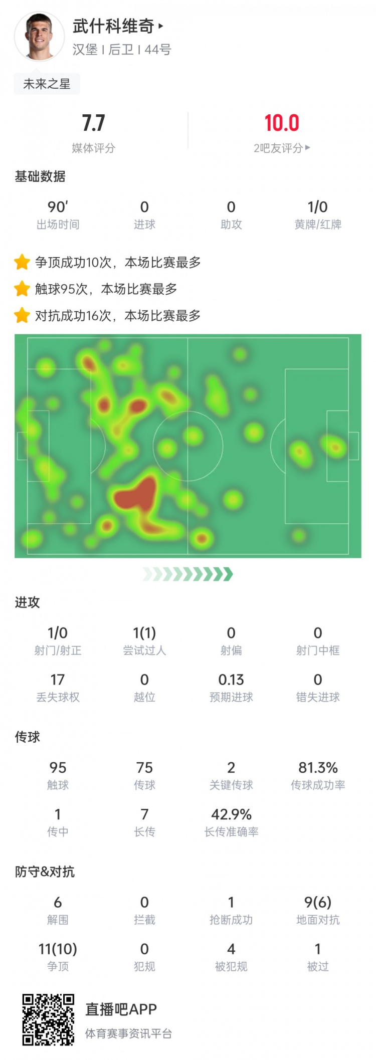 此役武什科维奇争顶得胜10次,全场最多。据Sofascore统计,本赛季武什科维奇在2场联赛中争顶得胜10+况兼得胜率迥殊90%,而五大联赛其他2021名球员加起来也只作念到2次。
