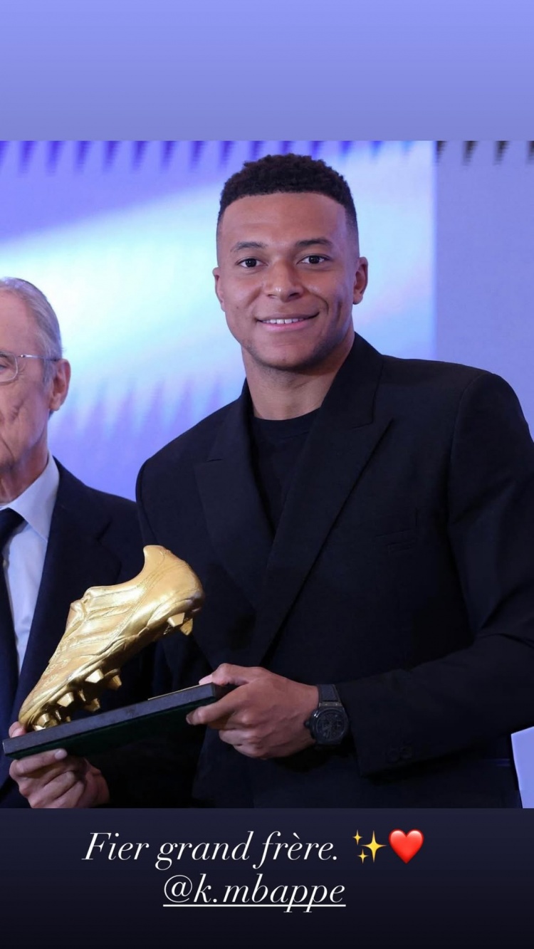 伊桑-姆巴佩社媒晒出哥哥领取欧洲金靴奖的像片,配文:“为你倨傲,苍老。”