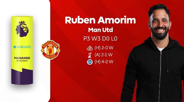阿莫林成为了第6位获取英超月度最好主帅的葡萄牙耕作,此前有努诺(7次)、穆里尼奥(4次)、博阿斯(2次)、布鲁诺-拉热(1次)以及佩雷拉(1次)。