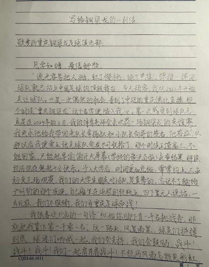 11月11日讯 重庆铜梁龙俱乐部官方社媒晒出了球迷的来信,并向这些给球队来信的球迷抒发了感谢。