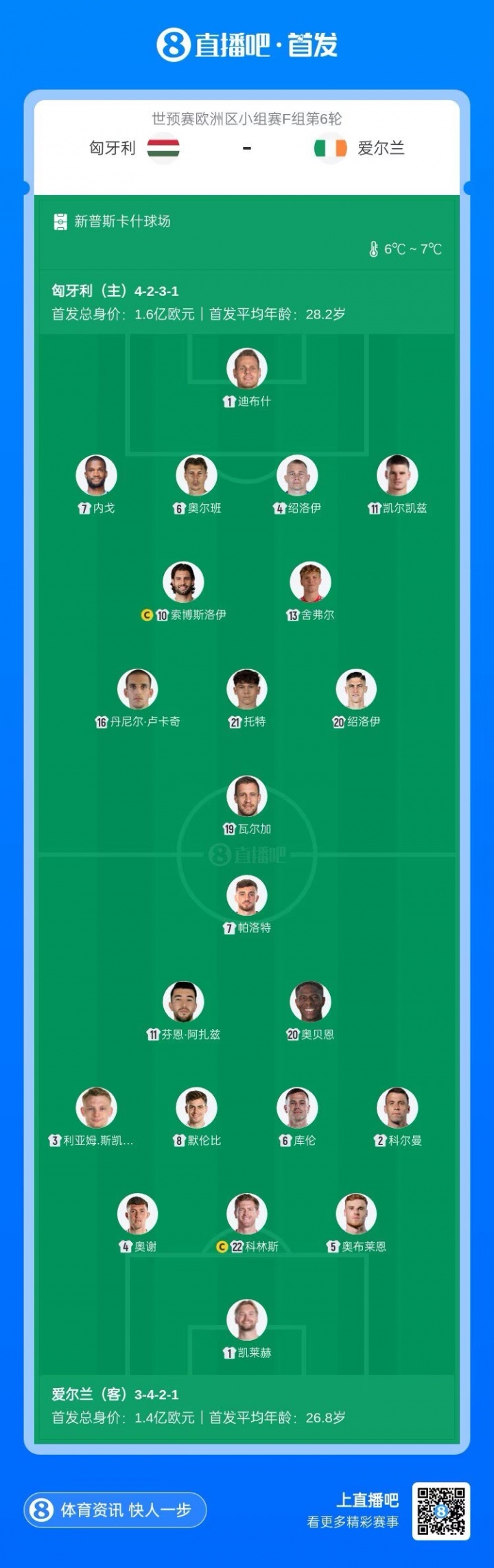 匈牙利vs爱尔兰首发:索博、凯尔凯兹先发,科尔曼、凯莱赫出战