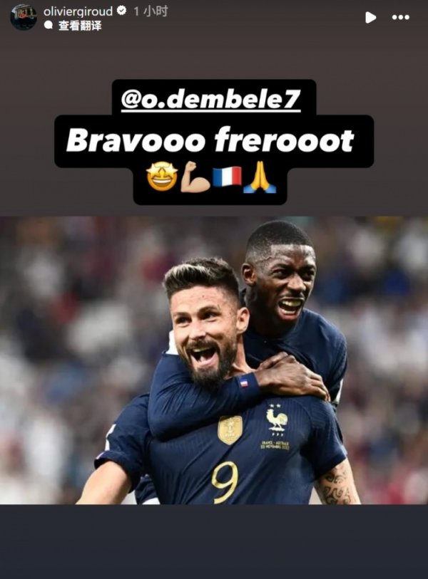 9月23日讯 登贝莱荣膺2025年金球奖,法国本家吉鲁也在社媒晒出往日合影为其奉上道喜。 吉鲁在社媒配文写谈:“太棒了,我的昆玉登贝莱!”......查看更多