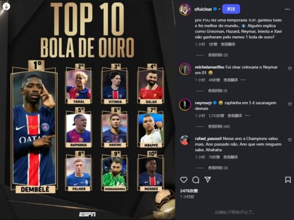09月23日讯 2025年金球奖受奖庆典,法国时尚登贝莱获取金球奖。 巴西球星内马尔讨教了一则记者发布的金球奖排行的图片,内马尔暗示:😂拉菲尼亚第五?这险些是疯了......查看更多
