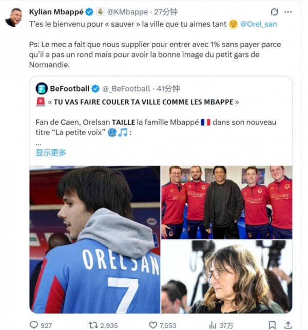 11月7日讯 卡昂队球迷、音乐东谈主奥雷尔桑在新歌中嘲讽姆巴佩一家,身为卡昂俱乐部雇主的姆巴佩社媒发文回怼。 奥雷尔桑的歌词:“别他X假装敬爱你那残骸的家乡。它已死气千里千里,是以才叫你们卡昂东谈主。那儿到处是你无法隐忍的乡巴佬,你会让你的城市蒙羞,就像姆巴佩眷属那样。” 姆巴佩社媒写谈:“随时接待你来‘调停’你嗜好的城市,奥雷尔桑。PS——那家伙整天乞求咱们让他只付1%的球票用度入场,因为他穷得叮当响,却思督察诺曼底憨厚小伙的形象。” 姆巴佩收购卡昂后,球队从法乙左迁,卡昂......查看更多