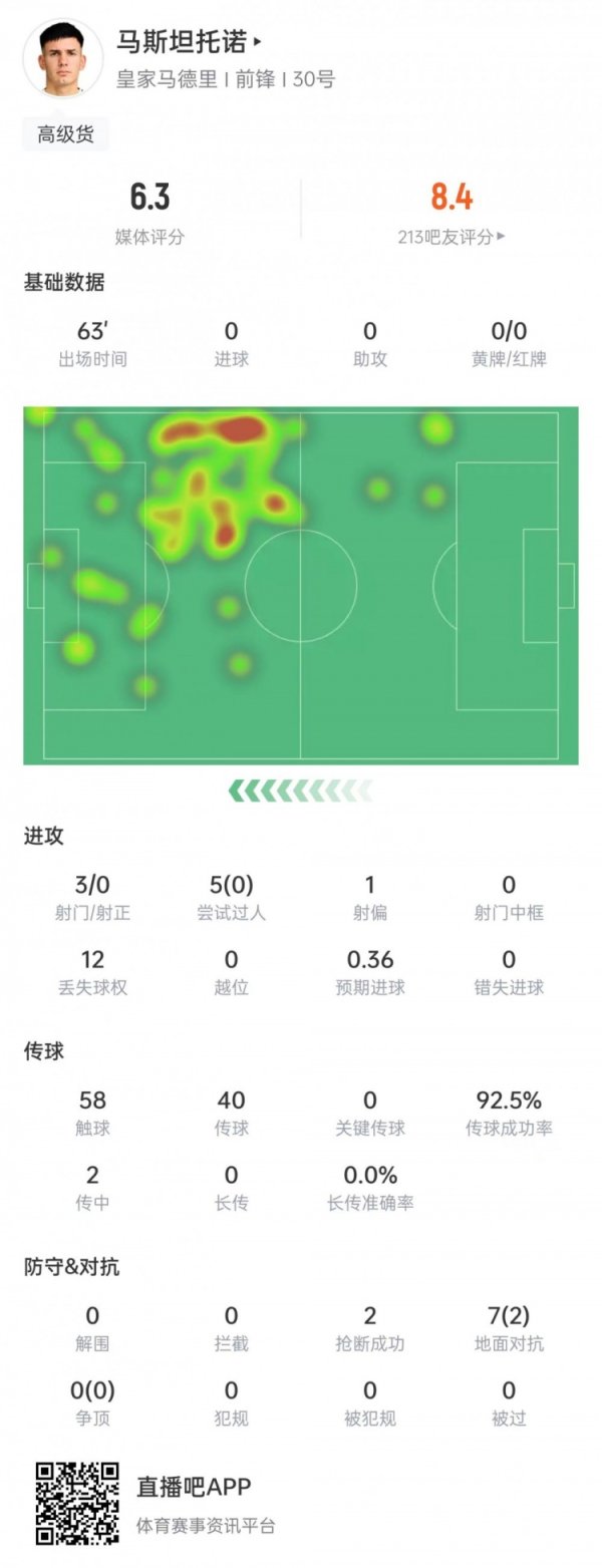 马斯坦托诺本场数据:3次射门0射正&5次过东谈主0见效,6.3分全队最低